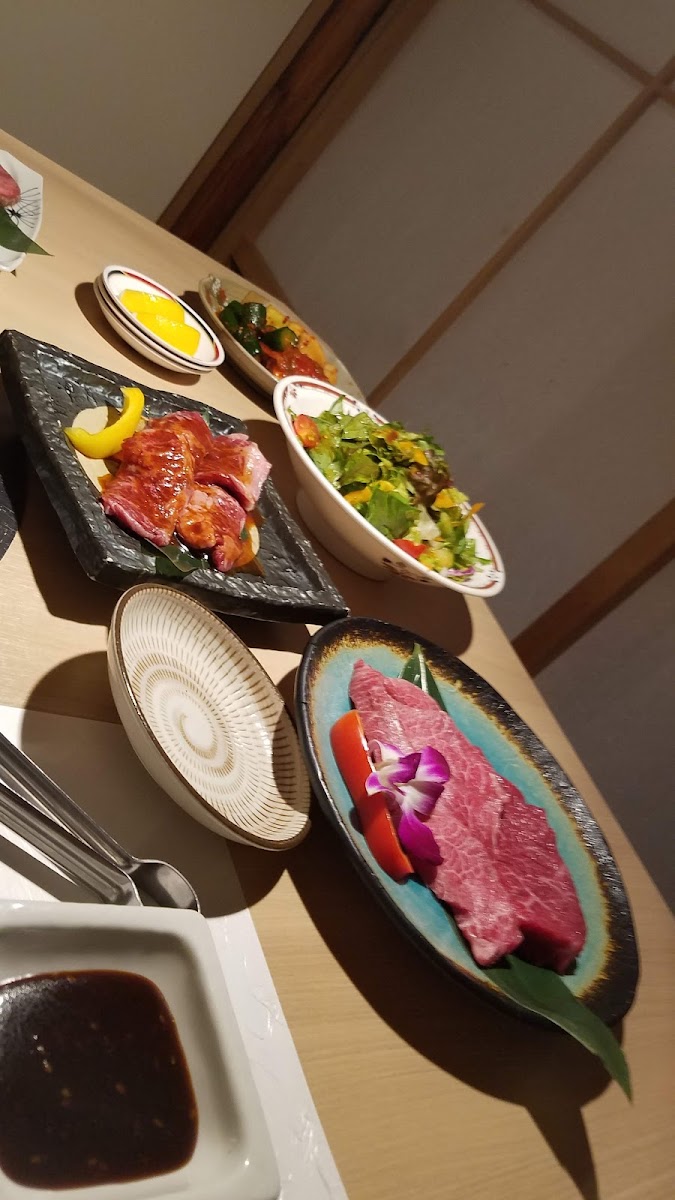 Gyuichi Dotombori shines in its signature dishes, offering a variety of options that bring out the best of yakiniku cuisine. One of the standout dishes is ビビンバ, a flavorful and well-balanced rice bowl that blends grilled vegetables, a fried egg, and seasoned beef, all topped off with a spicy sauce that adds the perfect kick. The richness of this dish pairs well with Gyuichi Dotombori's tender and juicy サラダ ハラミ ロース, a salad featuring the finest cuts of skirt steak, lightly seasoned and grilled to perfection. It’s a dish that embodies the essence of yakiniku-simple yet bursting with flavor.
